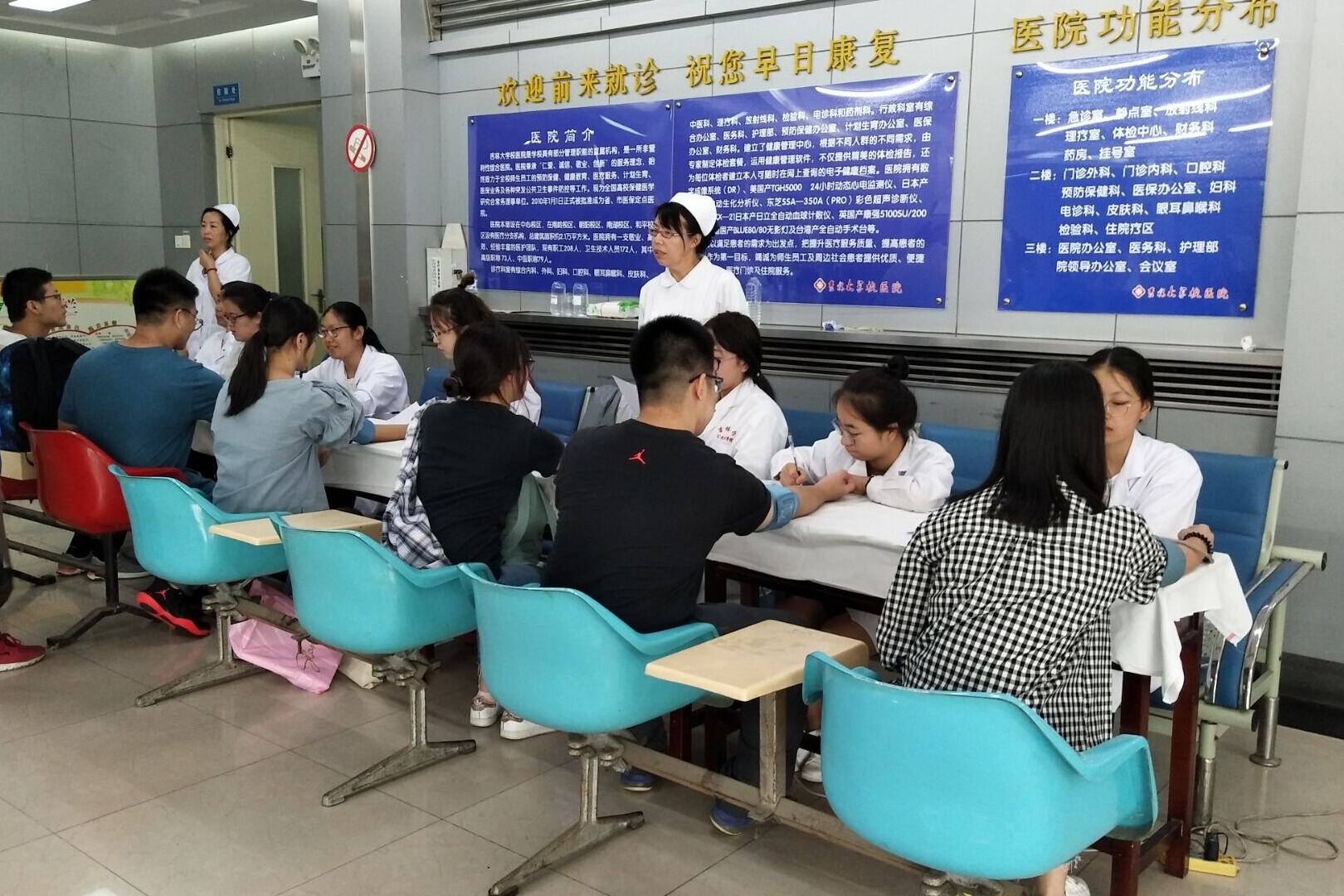 有40名同学作为新生体检志愿者协助校医院完成引导、血压测量等体检工作,校医院对志愿者们的细心工作给予肯定。